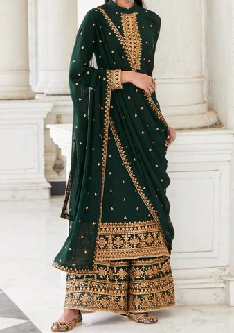 Elevate your wardrobe with this stunning embroidered green palazzo suit, featuring exquisite golden threadwork on luxurious green fabric. The set includes a matching dupatta and wide-legged palazzo trousers, offering both timeless elegance and superior comfort. Ideal for festive celebrations, weddings, or formal events, this ensemble promises to make you stand out with its sophisticated charm. Available in multiple sizes, crafted to provide a flattering fit for every body type. Experience the perfect blend of style and ease, designed to make every occasion memorable.